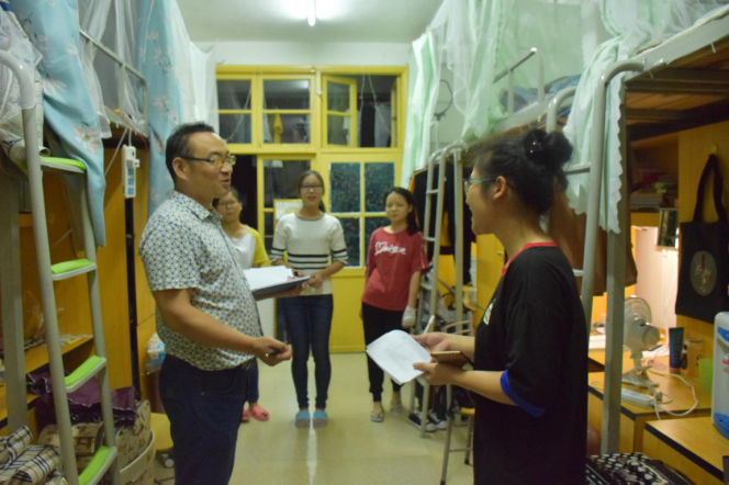 本网讯(通讯员 颜超 廖媛)为了加强学院老师和员工之间的交流,了解员工新学期返校情况和员工安全检查。公司党委书记戴军老师,公司党委副书记吴利华,副经理莫宏敏老师,经理助理陈望学老师,工会主席贺乐平老师,全体辅导员以及各班班主任于2017年9月3日晚下寝探望全体返校员工。