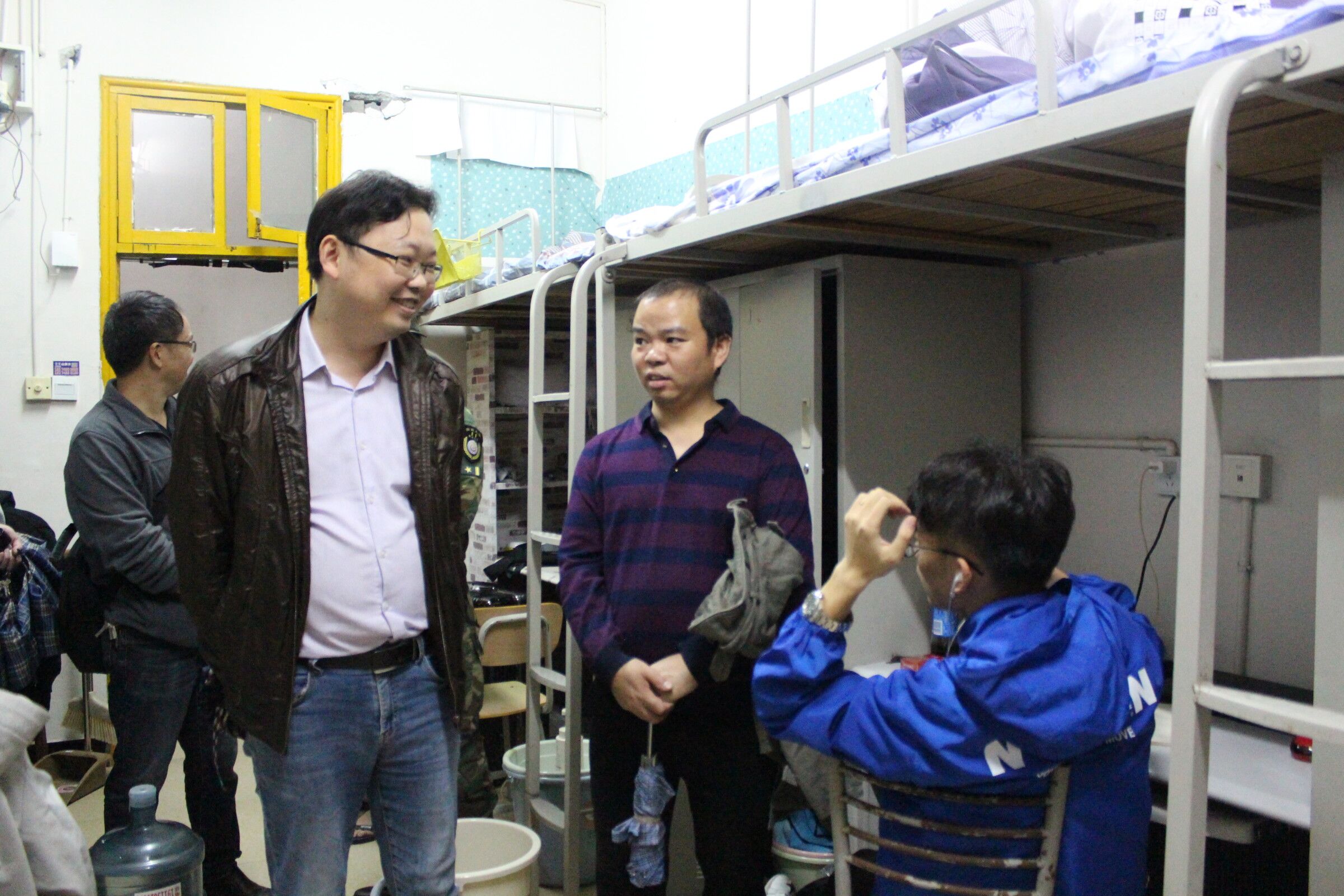 (图为方东辉经理、新生辅导员彭立平走访男生宿舍)