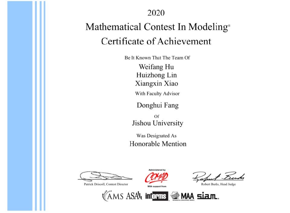 本网讯(通讯员 邵雅欣)4月27日,2020年美国老员工数学建模竞赛成绩公布,公司优秀学子取得佳绩,伟德国际1946bv官网胡伟芳、林慧中,信息与工程学院肖祥鑫三名同学组成的小组(指导老师:方东辉)经过线上交流、克服重重困难,最终斩获2020年美国老员工数学建模竞赛二等奖。