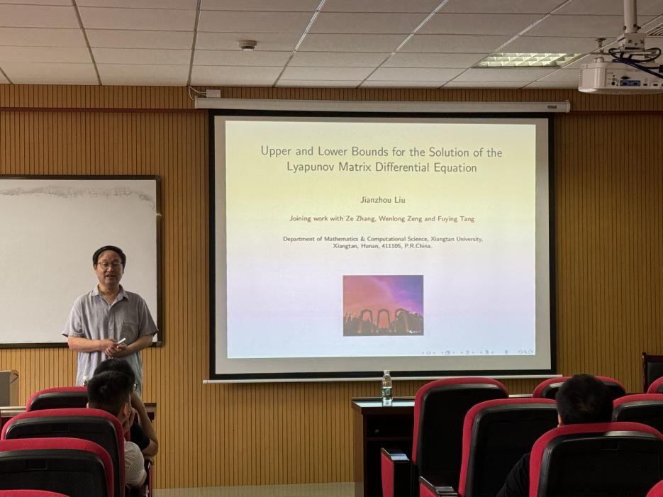 2024年5月11日上午,湘潭大学数学与计算科学学院刘建州教授受邀来我院作学术报告,报告的题目是Upper and Lower Bounds for the Solution of the Lyapunov Matrix Differential Equation。副经理莫宏敏、陈望学、研究生秘书黄家贤和部分研究生参加此次学术讲座,讲座由莫宏敏主持。