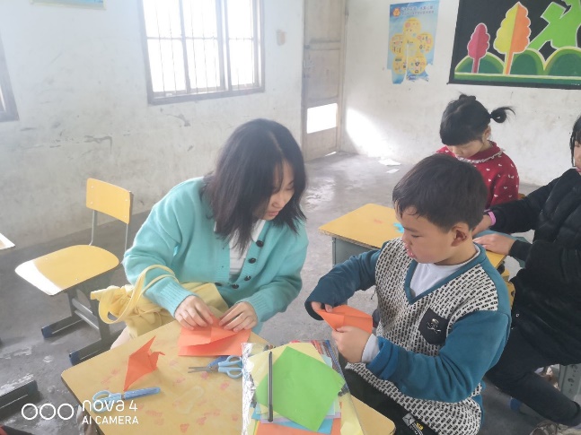 (图为 志愿者在教孩子们剪纸)