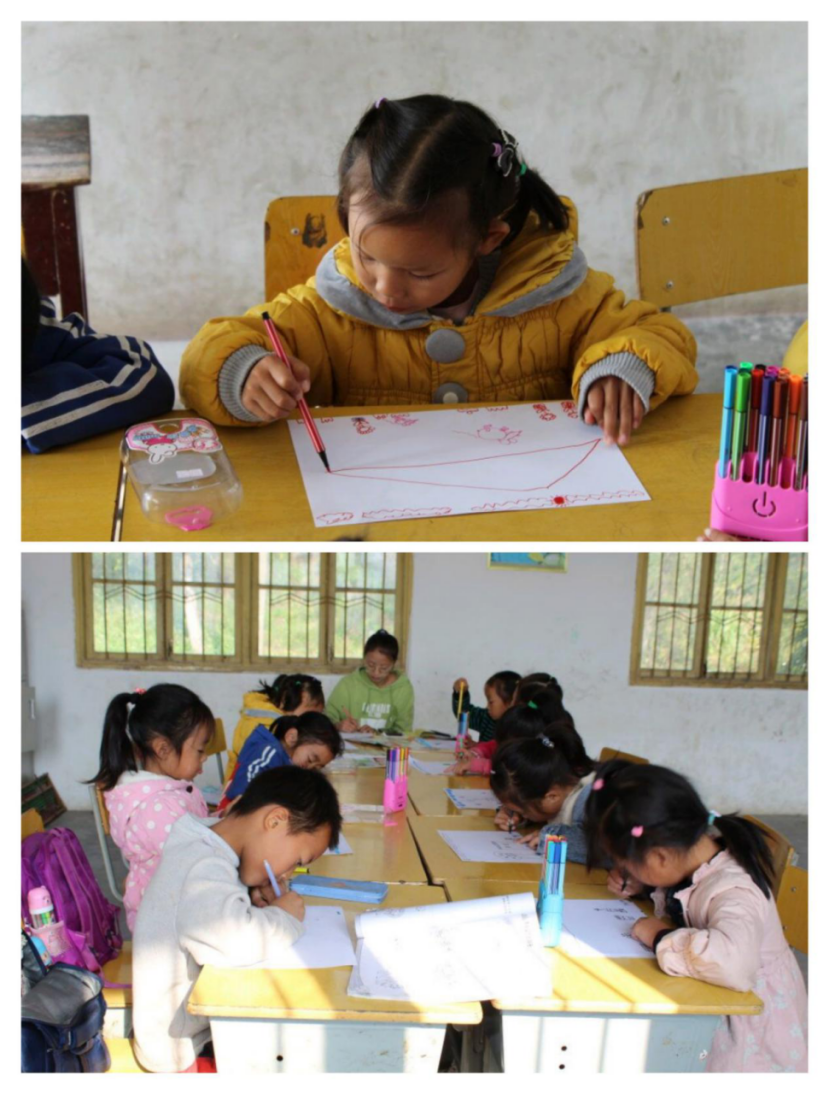 在绘画课上,有的孩子们肆意挥洒,有的认真作画,他们怀揣着一颗无邪的心,用手中多彩的画笔描绘出孩子们内心的童话世界。绘画课结束后,志愿者倾听了孩子们画画的缘由:有的孩子画的是一家人快快乐乐的生活情景,借此表达他们对父母的思念;有的孩子画的是所见之景,以表达他们对生活的喜爱之情。最后志愿者在班级内组织评画活动,通过投票的方式选出五幅优秀的作品,并将这些优秀的绘画作品在班上进行展出。